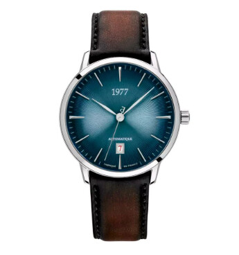 Le boîtier acier 40 mm fin s'associe à un bracelet cuir brun patiné aux surpiqûres ton sur ton — une palette bleu/brun/acier sophistiquée et moderne. Protégé par un verre saphir bombé inrayable, animé par un mouvement automatique français développé par la Manufacture France Ebauche (réserve de marche 44h, fréquence 28 800 a/h), ce garde-temps est couvert par offre une garantie exceptionnelle de 10 ans — rare et rassurante.