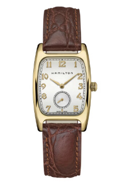 Le cadran blanc épuré révèle des chiffres arabes dorés stylisés au charme rétro immédiat, tandis que la petite seconde à 6h ajoute cette touche horlogère classique qui fait toute la différence. Le chemin de fer indiquant les minutes sur le bord du cadran accentue le style élégant de cette pièce horlogère. Les aiguilles dorées complètent harmonieusement cette création signée Hamilton.