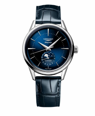 Cette création Longines Flagship Heritage revisite avec finesse un modèle historique des années 1950, grâce à un sublime cadran bleu effet soleillé. Il est doté d’un affichage date et phase de lune à 6h, une complication poétique recherchée par les amateurs de belles créations horlogères.