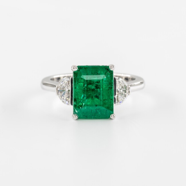 Bague en or blanc avec émeraude zambienne et diamants en demi-lune