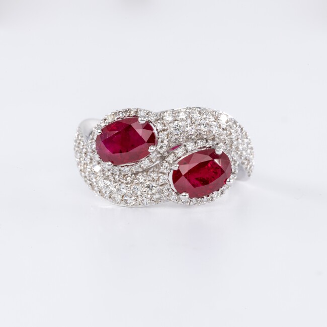Bague en or blanc centre deux pierres rubis taillés en ovale accompagnés de diamants