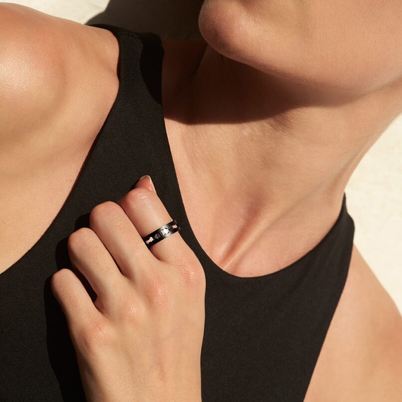 Le contraste entre le noir mat du titane et les facettes polies des motifs accentue la profondeur du dessin. L’intérieur de l’anneau, en or blanc lisse, assure une finition impeccable et un confort optimal.