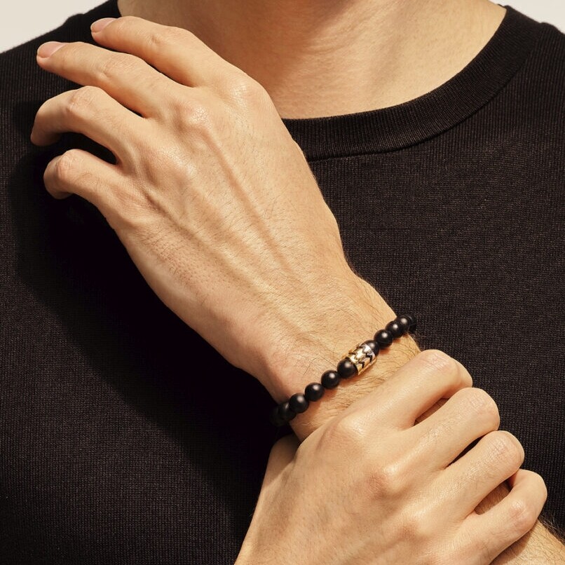 Le bracelet présente une succession régulière de perles d’onyx parfaitement polies. Au centre, le motif Capture Trilogy associe trois éléments imbriqués aux formes anguleuses, chacun réalisé dans un or différent. Les surfaces polies miroir captent la lumière, créant un contraste subtil avec la matité des perles.