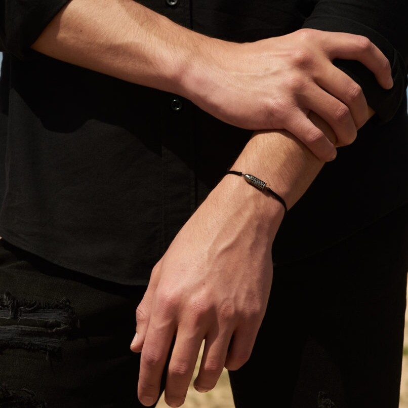 L'architecture de ce bijou unisexe révèle un cylindre de 21 mm orné d'un pavage intégral qui transforme le poignet en territoire d'expression personnelle. Reprenant la forme d'une balle de revolver, ce bracelet symbolise l'amour et revisite la flèche de cupidon. ce bracelet représente aussi la cible, l'objectif de vie que l'on atteint avec conviction. Ici, la surface noire mate contraste avec l'éclat discret des diamants, créant un jeu subtil entre ombre et lumière. Un bijou d'exception, pour une allure citadine et sophistiquée.