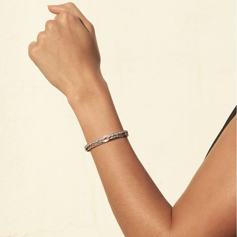 Ce bracelet dévoile une silhouette ouverte aux découpes graphiques saisissantes, où chaque croc capte et redistribue la lumière. L'asymétrie calculée des volumes triangulaires crée un dialogue visuel permanent entre ombres et reflets. Conçu comme une pièce "(-)", il s'imbrique parfaitement avec son pendant "(+)", offrant une modularité unique pour les amateurs de bijoux haut-de-gamme créatifs.