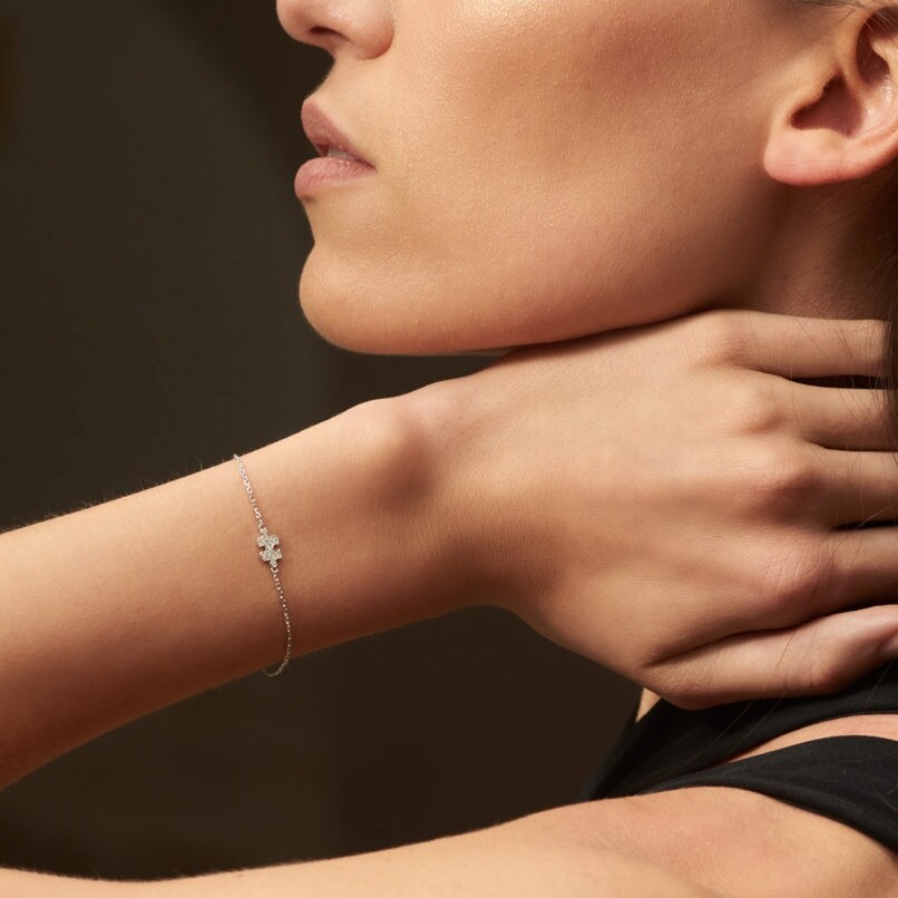 Le bracelet se compose d’une chaîne délicate ponctuée d’un motif puzzle central aux contours géométriques nets. Les arêtes sont adoucies et polies miroir, créant un contraste subtil avec le pavage diamanté.