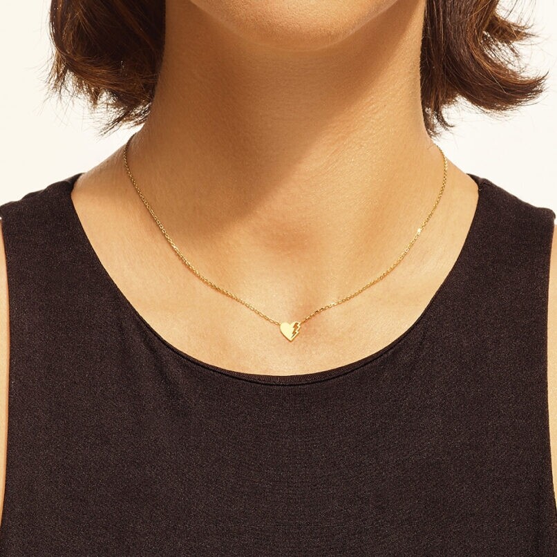 Le pendentif se compose d’un cœur plein aux lignes douces, dont la surface parfaitement lisse est interrompue par une découpe angulaire en forme d’éclair. Cette ouverture crée un contraste visuel fort entre rondeur et tension. La bélière discrète assure une suspension fluide, mettant en valeur l’équilibre des volumes et la précision des contours.