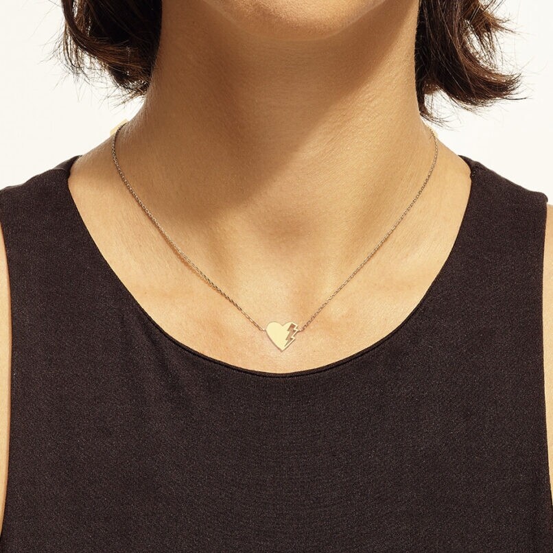 Le cœur stylisé révèle ses contours épurés, traversé par un éclair au tracé incisif qui anime sa surface polie. Cette foudre graphique transforme l'emblème romantique classique en manifeste contemporain, où la passion rencontre la modernité. Le pendentif oscille délicatement le long de sa chaîne, captant et réfléchissant la lumière à chaque mouvement.