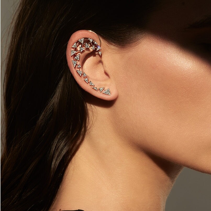 La boucle épouse naturellement la courbe de l'oreille, du lobe jusqu'au pavillon, créant une silhouette triangulaire inattendue. Sa structure constellée de motifs triangulaires reliés entre eux par une monture très discrète donne un effet aérien et léger à l'ensemble. Les griffes invisibles maintiennent délicatement chaque diamant, préservant la fluidité du design.