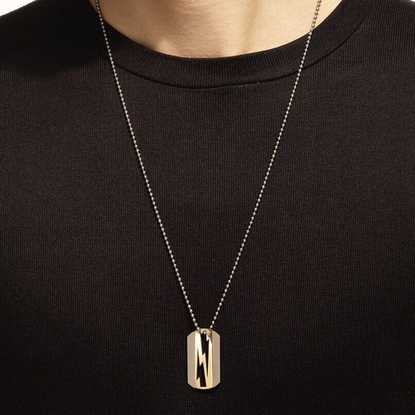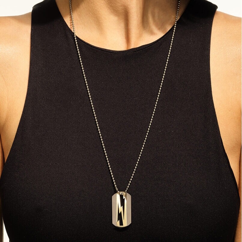 Avec ce pendentif Akillis LoveTag, la maison revisite la plaque identitaire dans une version joaillière contrastée. La collection LoveTag s’inspire des symboles personnels et les transforme en pièces contemporaines, où le motif de l’éclair incarne l’énergie et la singularité.